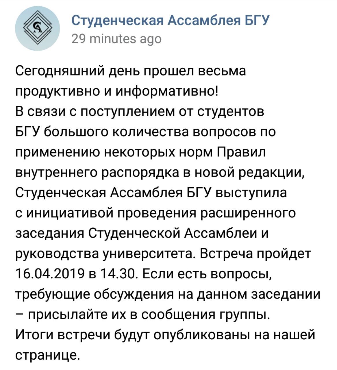 Сегодня прошла встреча представителей Студенческой Ассамблеи БГУ и администрации университета, где обсуждалась и новая редакция ПВР.