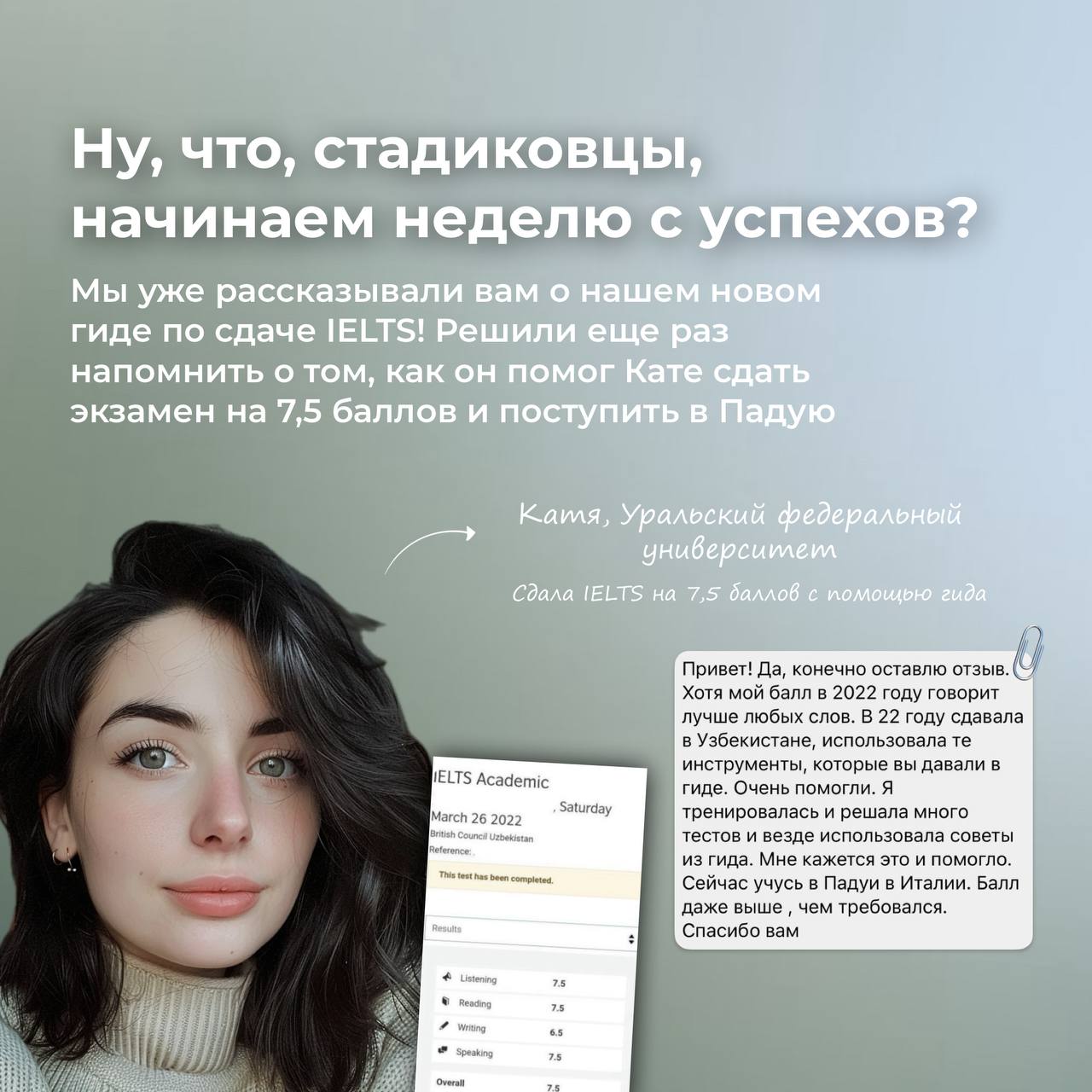 Делимся еще одним мини-кейсом нашей подписчицы Кати. Она сдала IELTS на 7,5 баллов, используя стратегии из нашего гида. А теперь учится в Падуанском университете в Италии.