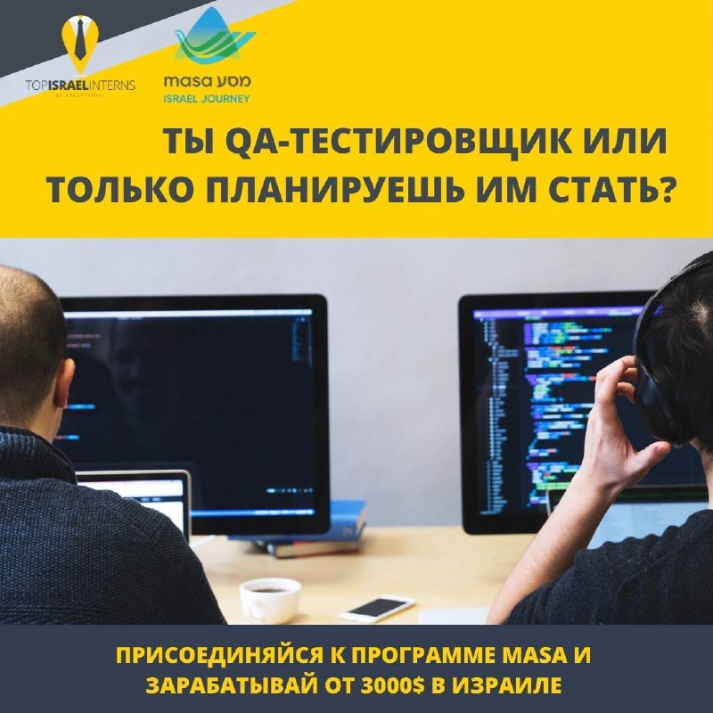 С курсом обучения "QA Testing Automation" от Masa вы станете востребованным специалистом менее чем, за 1 год с достойной ЗП от 3000$ в самом сердце Израиля.