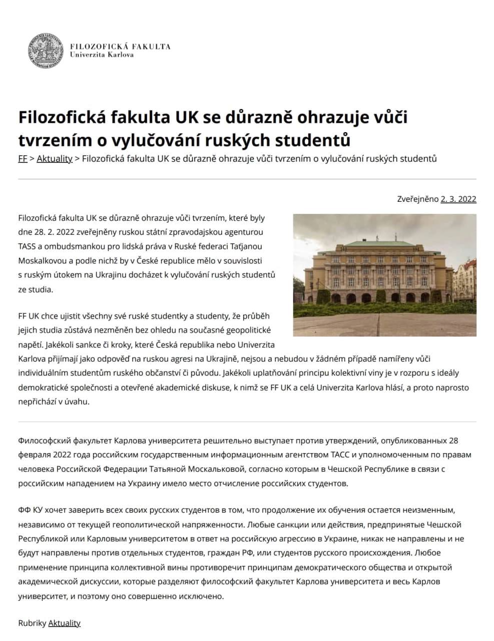 "Философский факультет Карлова Университета хочет заверить всех своих русских студентов в том, что продолжение их обучения остаётся неизменным, независимо от текущей геополитической напряжённости. Любые санкции или действия, предпринятые Чешской Республикой или Карловым университетом в ответ на российскую агрессию в Украине, никак не направлены и не будут направлены против отдельных студентов, граждан РФ, или студентов русского происхождения. Любое применение принципа коллективной вины противоречит принципам демократического общества и открытой академической дискуссии, которые разделяют философский факультет Карлова университета и весь Карлов университет, и поэтому оно совершенно исключено."