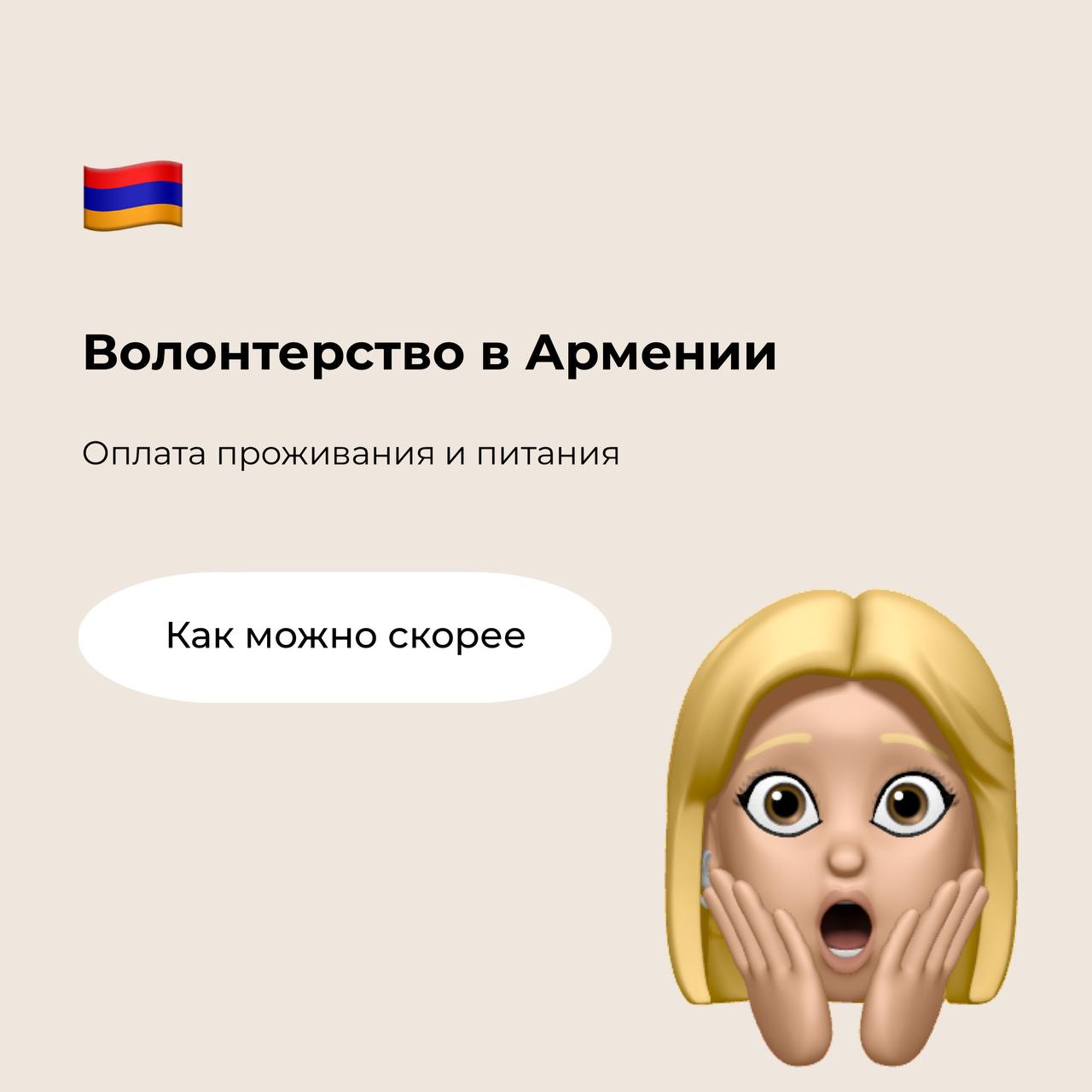 Открыт прием заявок от международных волонтеров для участия в волонтерских лагерях в Армении. Доступны такие области, как культура, экология, работа с детьми. На проекты берут волонтеров возрастом от 18 лет и старше. С Арменией открыто авиасообщение, виза не нужна. Оплата проживания и питания предоставляется на месте. Для участия нужно заплатить взнос принимающей стране и организации, знать английским на разговорном уровне.