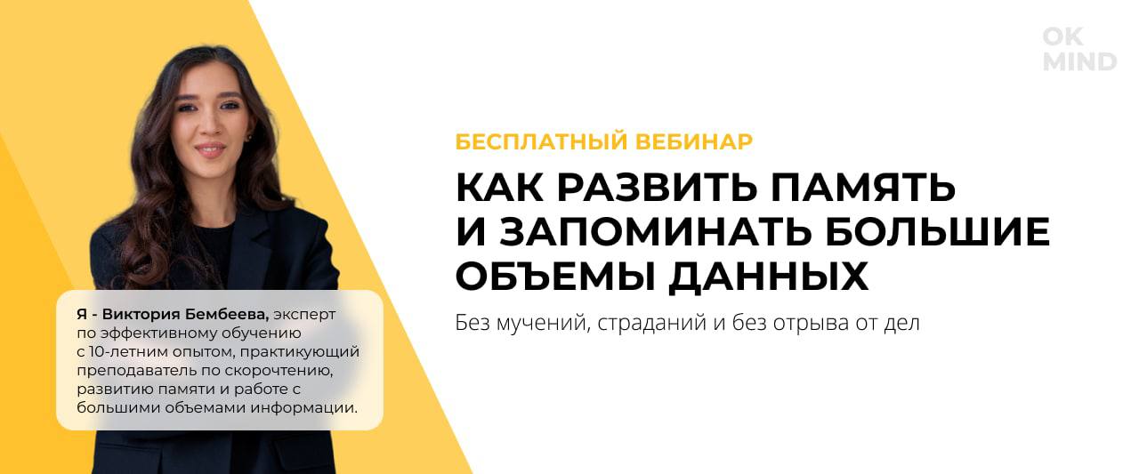 Приходите на бесплатный вебинар «Как развить память и запоминать большие объемы информации» от эксперта по эффективному обучению с 10-летним опытом Виктории Бембеевой