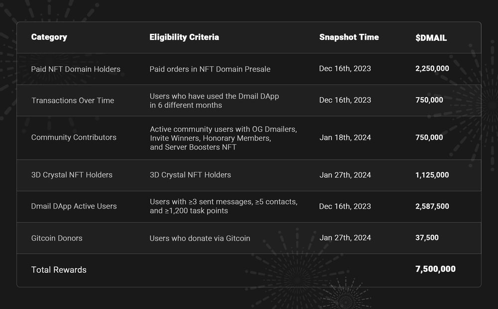 • Будет распределено 7,500,000 $DMAIL (3,75 % от общего объема токенов $DMAIL и 62,5 % от пула Airdrop)