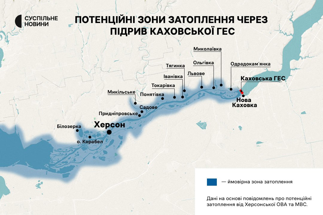 Станом на зараз повністю або частково затоплені понад десять населених пунктів, повідомили в Херсонській ОВА. Близько 16 тисяч людей на правобережжі Херсонщини у критичній зоні.