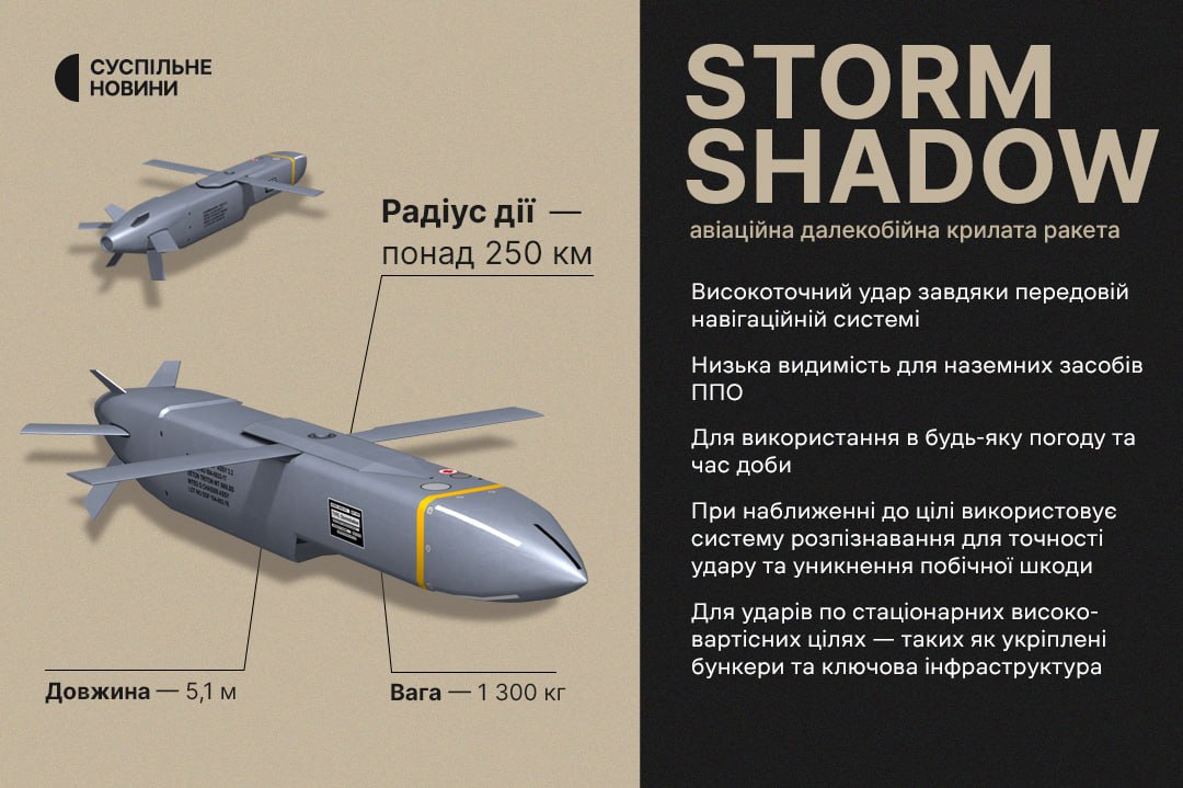 Storm Shadow, що Україна отримає від Великої Британії, — авіаційна ракета французько-британського виробництва, яку застосовували в бойових діях у Перській затоці, Іраку та Лівії. Виробник, французька компанія MBDA, зазначає, що ракета здатна працювати «в екстремальних умовах» та дозволяє планувати складні місії з глибокими ударами. Зібрали основні характеристики.