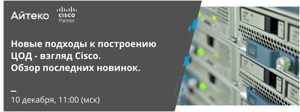 Компания Айтеко совместно с Cisco приглашает вас 10 декабря в 11:00 (мск) на онлайн-мероприятие, посвященное подробному обзору последних новинок и подходов к построению ЦОД.