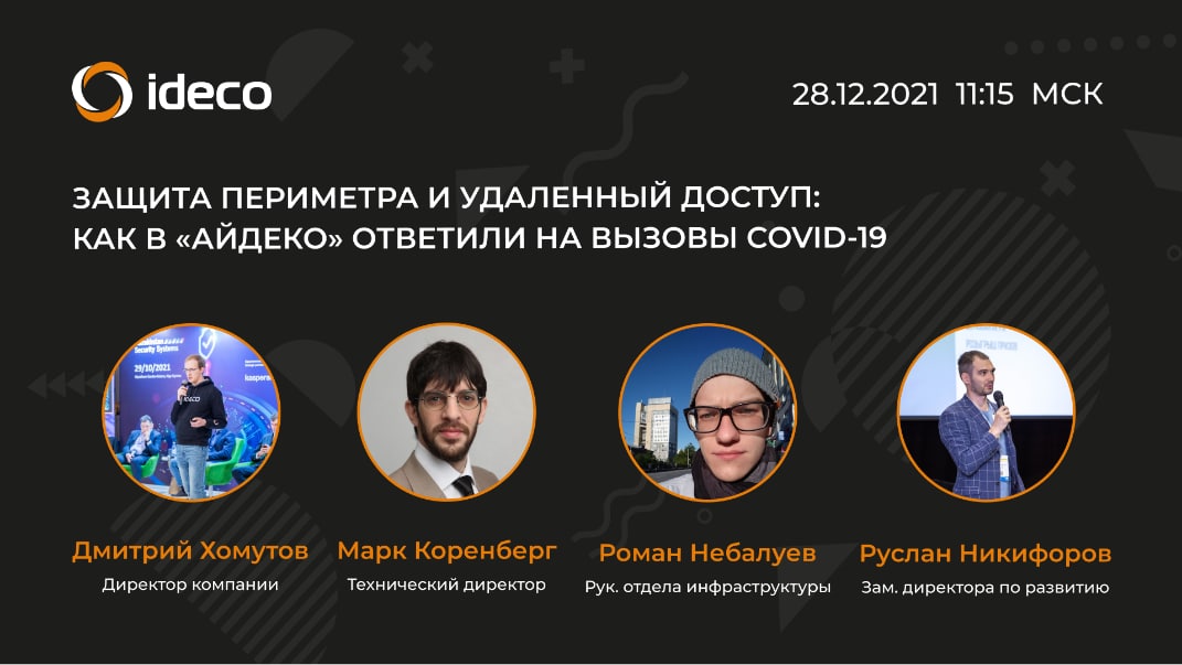 Коллеги, завершаем год полезным вебинаром и поговорим на тему: «Защита периметра и удаленный доступ: как в «Айдеко» ответили на вызовы Covid-19».