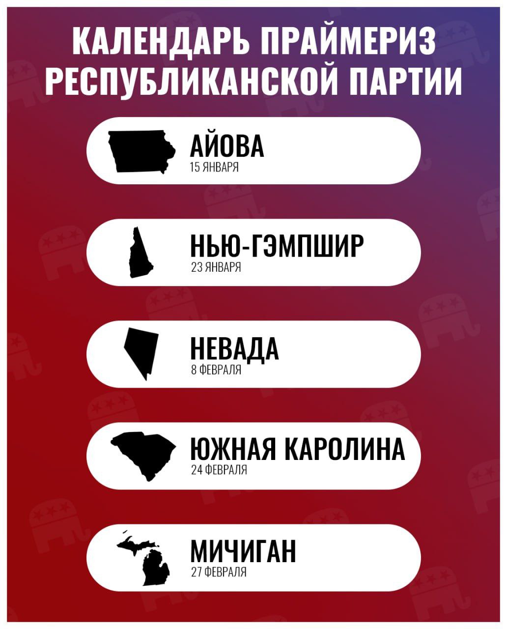 На карточке ниже можно найти информацию о датах и местах первых четырех внутрипартийных голосований Республиканцев.