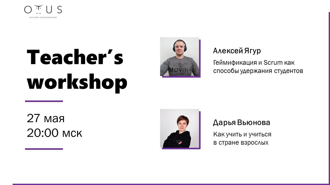 Уже завтра (27.05) в 20:00 пройдет Teacher’s workshop.
