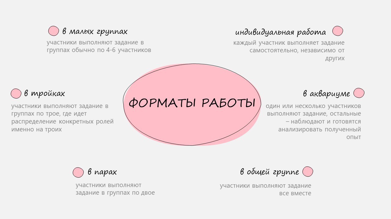 Мы решили вам расширить описание и перечислить основные форматы работы, которые используются в активных формах обучения.