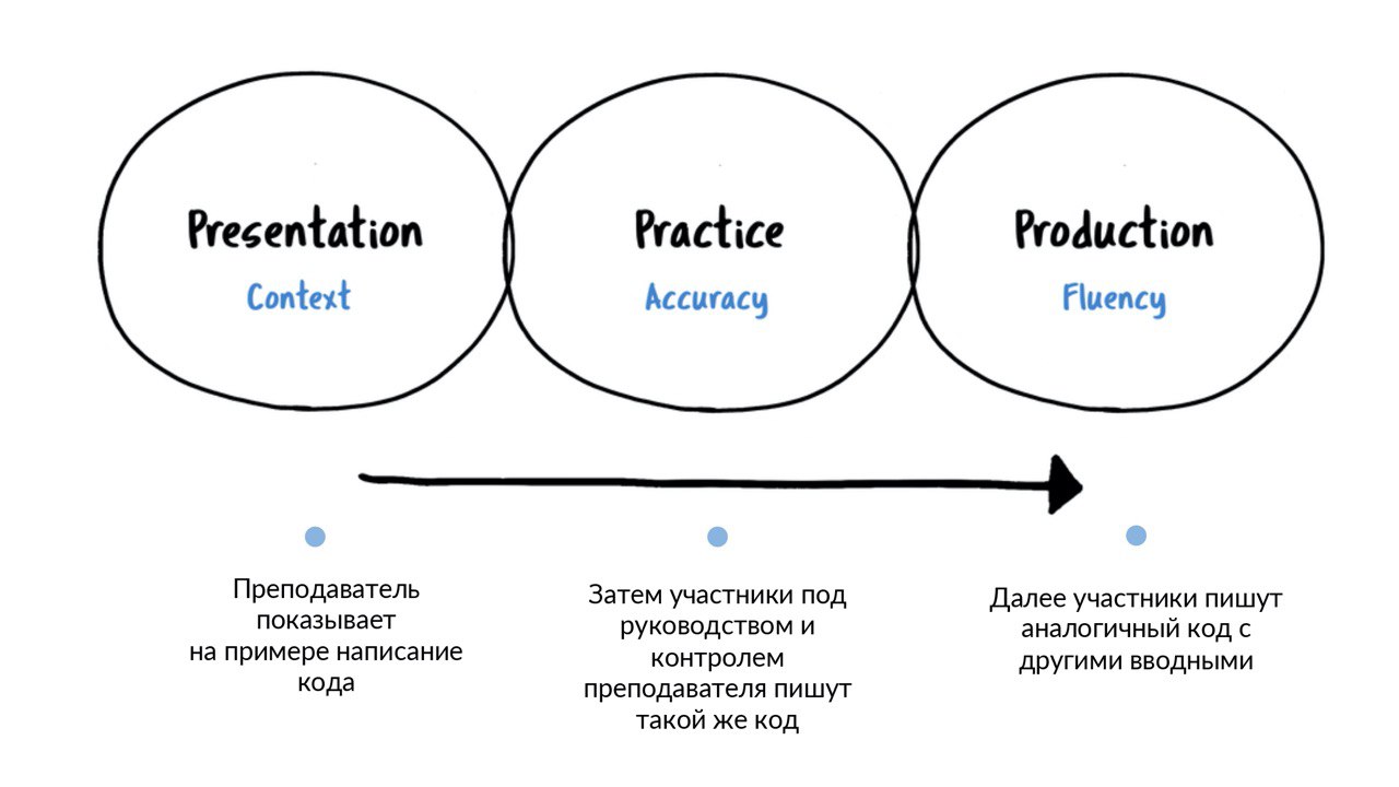 В прошлый четверг мы вам загадали один из методов преподавания 🤔 и большинство проголосовали за «Learning by doing» и... были неправы 😔 Правильный ответ «Presentation-Practice-Production».