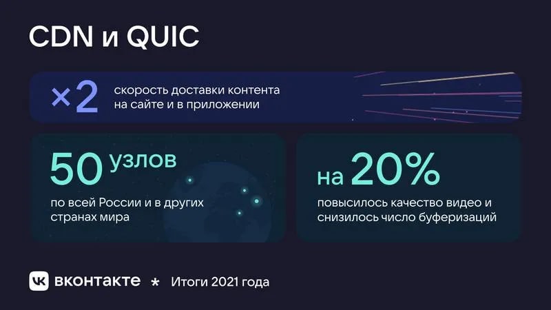 В отчёте о проделанной работе за этот год упоминалось, что «ВКонтакте» анонсировала запуск одной из крупнейших в России геораспределённых CDN-сетей и ряда собственных технологий: адаптивного видеостриминга с масштабируемой архитектурой, интеллектуальной системы рекомендаций и поисковой платформы, единой шины VK для простой интеграции технологий в другие сервисы компании. Помимо этого, VK открыла SDK «VK Звонков» для разработчиков IT-сервисов — последнее обстоятельство позволяет интегрировать большинство функций в сторонние продукты.