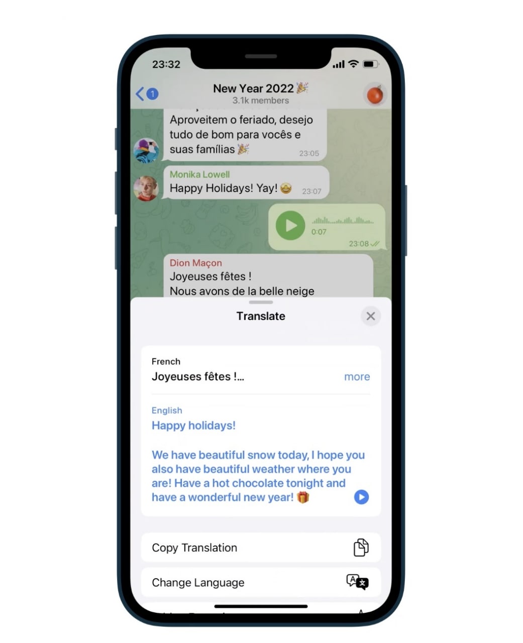 30 декабря 2021 года Telegram выпустил обновление, с которым в мессенджере появился перевод сообщений на другие языки. Он появляется, если выбрать сообщение и нажать «Перевести» в меню.