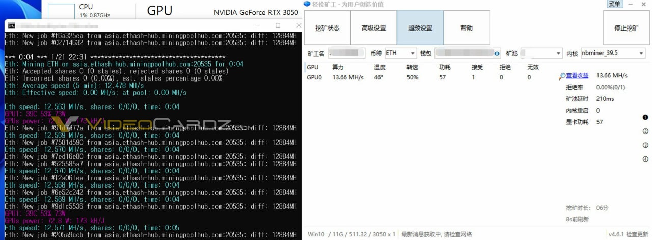 Ещё один китайский блогер подтвердил эту информацию, опубликовав аналогичные результаты с использованием другого программного обеспечения для майнинга. В его случае GeForce RTX 3050 выдавала 13,66 MH/s при энергопотреблении 57 Вт.