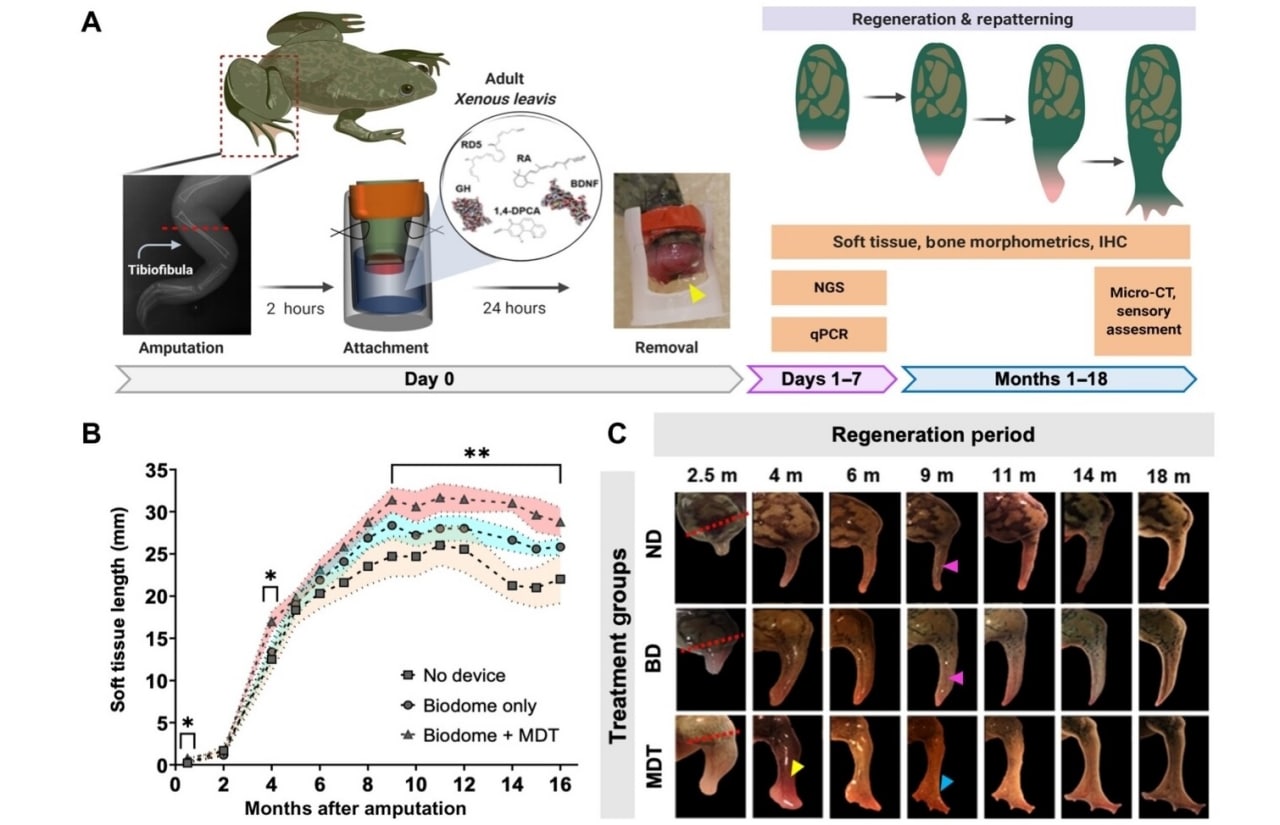 Для регенерации на культи надели колпачки из силикона и паутинного шелка, в которых находился гидрогель с коктейлем из сигнальных белков. Он воздействует на генетический код, не давая фиброзной ткани затянуть рану, а также активирует восстанавливающие механизмы, которые исчезают с возрастом. Головастики могут полностью отрастить конечности, но взрослые особи лишены этой способности.