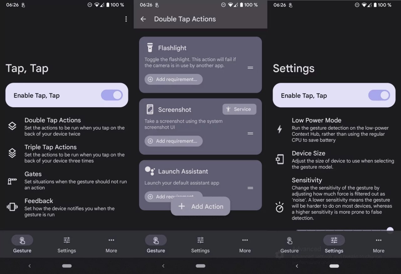 TapTap поддерживает действия двойного и тройного касаний, а также использует систему приоритетов с несколькими действиями для каждого жеста. Например, действия после касаний в верхней части корпуса могут иметь приоритет над действиями, которые выполняются после касаний в нижней части. Можно обозначить жесты для управления звуком, но сделать их активными только при воспроизведении чего-либо. Или установить желаемое действие, когда запущено определённое приложение, включен / выключен экран и так далее. В настройках утилиты есть возможность установить чувствительность касаний, чтобы определить усилие для выполнения жеста и избежать ложных срабатываний.