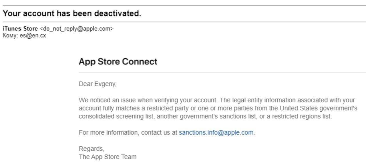 В оповещениях говорится, что «при верификации учётной записи была обнаружена проблема: информация о связанном с ней юридическом лице соответствует субъекту, в отношении которого введены ограничения, либо оно находится в санкционных списках США, либо доступ ограничен для страны юрлица». За разъяснениями можно обратиться на почту sanctions.info@apple.com.