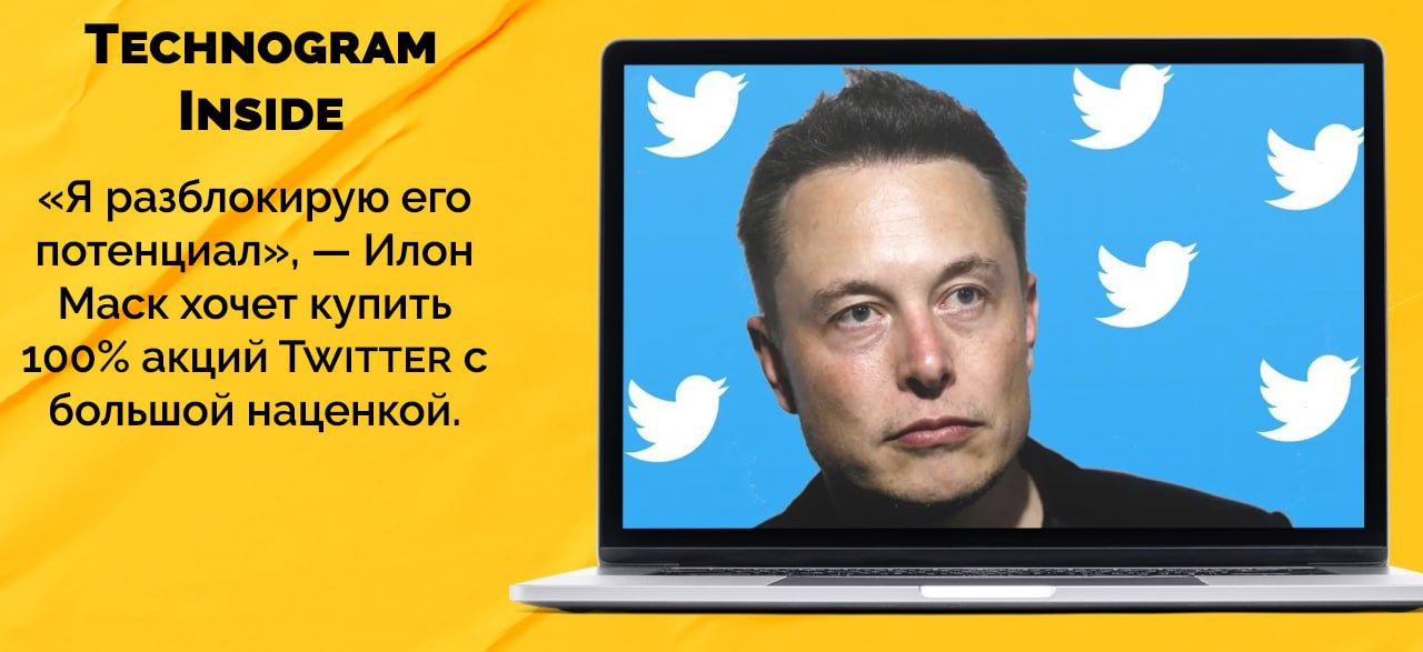 Генеральный директор Tesla Илон Маск сделал предложение совету директоров Twitter: он хочет выкупить 100% акций по $54.20 за штуку. Сумма сделки должна составить около 43 млрд долларов.