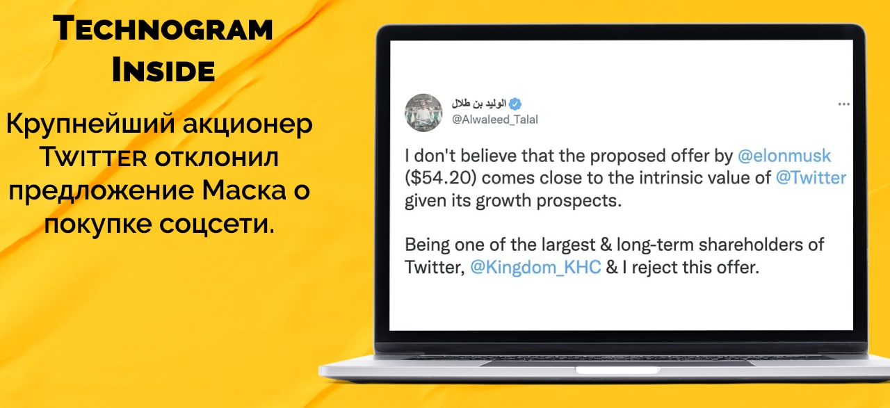 Саудовский принц Аль-Валид ибн Талал Аль Сауд усомнился: «Я не верю, что предложение Маска ($54,20 за акцию) соответствует реальной стоимости Twitter, учитывая перспективы его роста»