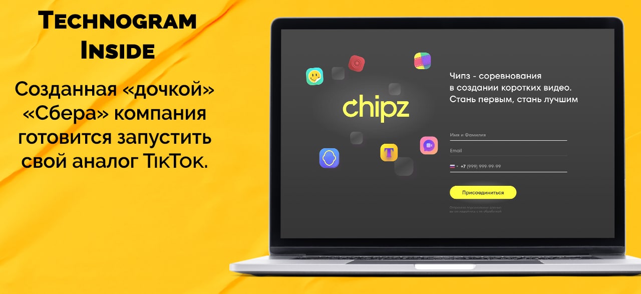 Сервис коротких видео называется Chipz. Судя по его сайту, пользователи уже могут присоединиться к закрытому тестированию. В политике конфиденциальности указано ООО «ЕСН» — по данным «Контур.Фокуса», эту компанию в феврале 2021 года создало ООО «Сберинтертеймент». На апрель 2022 года 79% «ЕСН» принадлежало «Сберинтертейменту», 20% — кипрской «Новус унус лимитед». Сейчас учредители не раскрываются.
