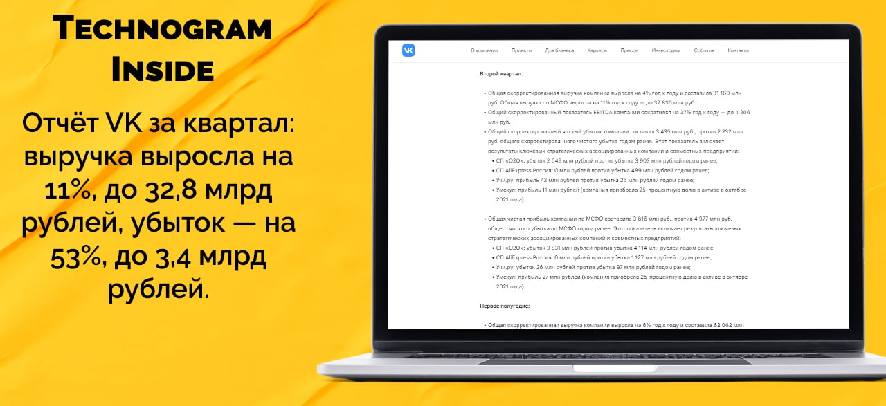 VK опубликовала неаудированную отчётность за второй квартал 2022 года. Общая скорректированная выручка выросла на 4% год к году и составила 31,1 млрд рублей, общая выручка по МСФО выросла на 11%, до 32,8 млрд рублей. Скорректированный показатель EBITDA сократился на 37% год к году — до 4,2 млрд рублей.