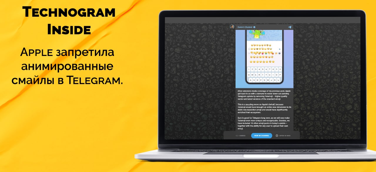 "После распространения в СМИ моего предыдущего поста Apple ответила нам с требованием «урезать» обновление Telegram, удалив Telemoji — качественные векторные анимированные версии стандартных смайликов. Это странный шаг со стороны Apple, так как Telemoji призваны не повлиять на целостность системы и дизайна, а, наоборот, привнесут «новое измерение» в стоковые статические смайлы с низким разрешением", — говорит Павел Дуров.