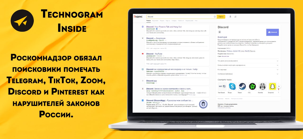 Роскомнадзор обязал поисковики помечать Telegram, TikTok, Zoom, Discord и Pinterest как нарушителей законов России