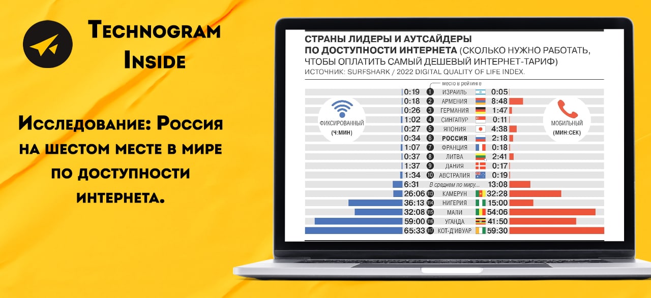 Согласно исследованию, самый доступный стационарный интернет в Армении и Израиле, где для оплаты нужно работать по 18 и 19 минут соответственно. При этом в Израиле также рекордно дешёвый мобильный интернет. На то, чтобы оплатить наиболее доступный тариф требуется всего 5 минут работы.