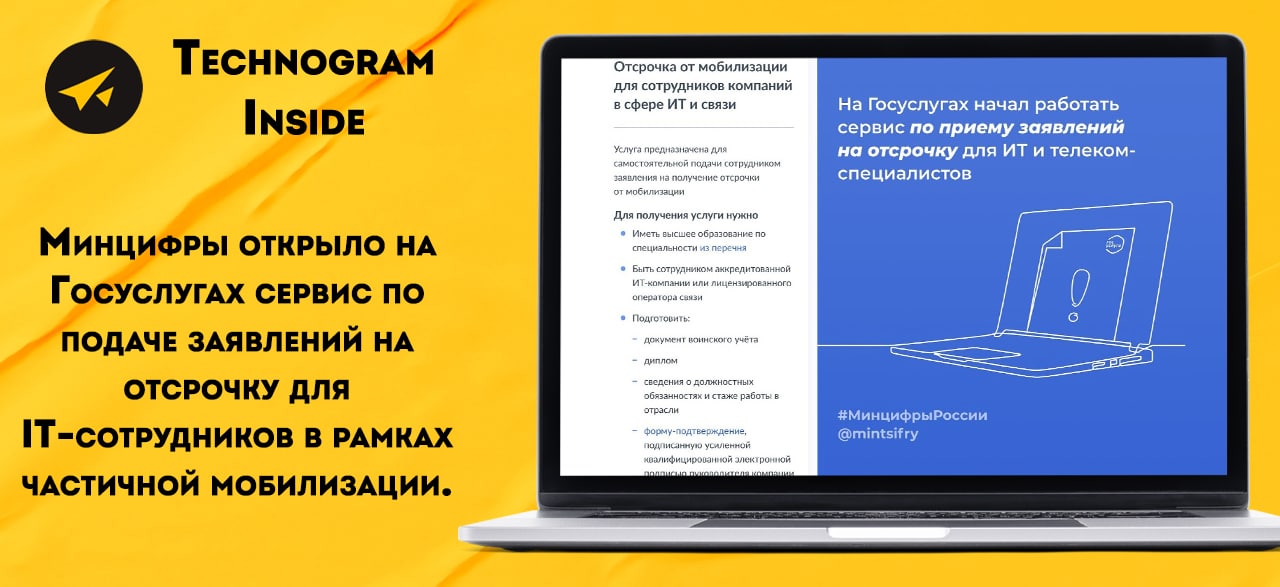 27 сентября 2022 года Минцифры открыло на портале «Госуслуги» сервис по подаче заявлений на освобождение сотрудников IT и телеком-компаний от призыва в рамках частичной мобилизации.