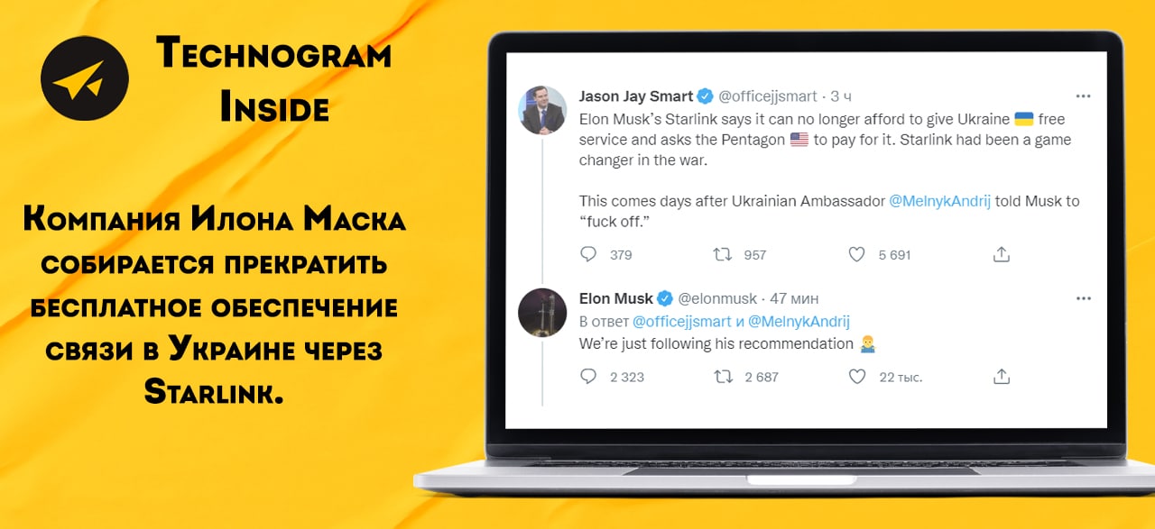 3 октября Маск провел у себя в Твиттере опрос по поводу того, каким образом надлежит завершить конфликт в Украине. В его реплаях отличился посол Украины в Германии, который нехитро послал Маска на четыре буквы («fuck off»).