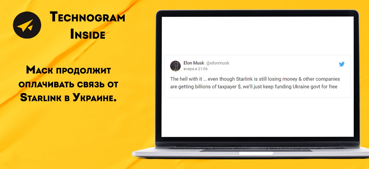 "Черт с ним. Пусть Starlink все еще теряет деньги, а другие компании получают миллиарды долларов налогоплательщиков, мы продолжим бесплатно финансировать правительство Украины", – написал американский миллиардер на своей странице в Twitter.