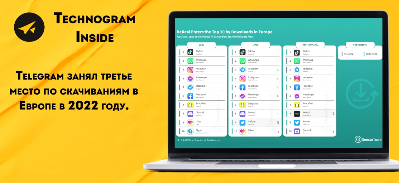 Telegram занял третье место по скачиваниям в Европе в 2022 году