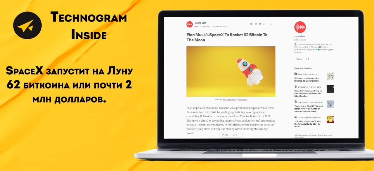 Криптопроект LunarCrush заявил, что осенью 2023 года отправит закрытый ключ к криптокошельку с 62 биткоинами на Луну при помощи ракеты SpaceX.