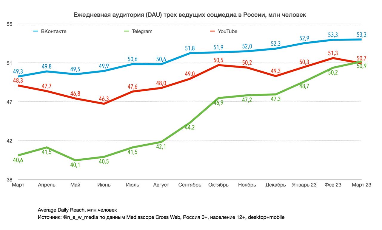 Ежедневная российская аудитория мессенджера в марте составила 50,9 млн человек, видеохостинга — 50,7 млн. Рост ежедневной аудитории Telegram с января 2022 года составил плюс 104%.