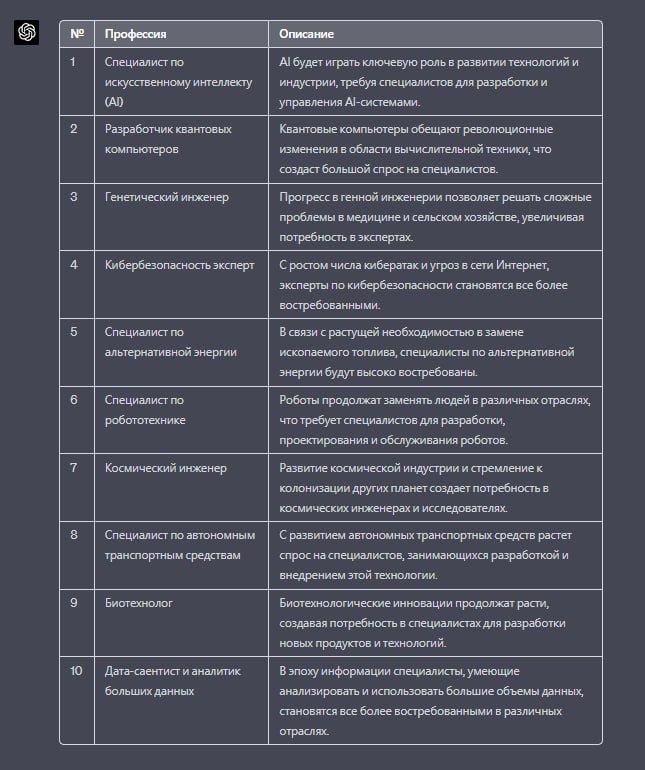 ChatGPT назвал 10 самых перспективных профессий