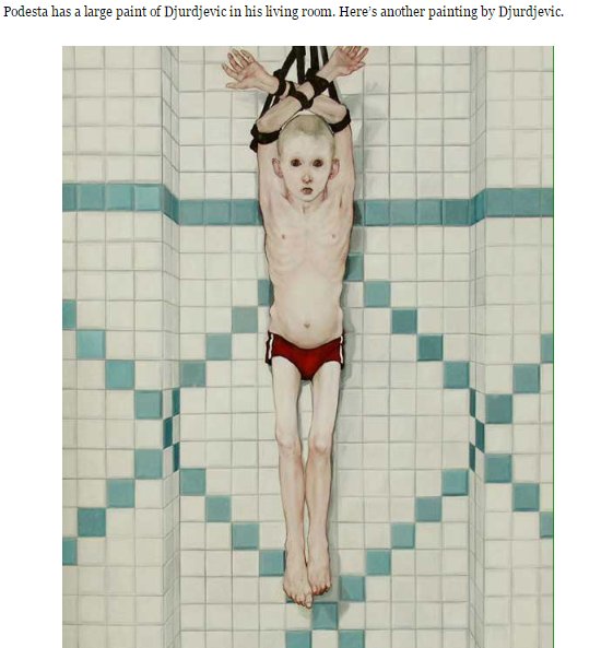 Всем же желающим постебаться по поводу самой возможности ритуальных убийств, я предлагаю посмотреть на картину внизу. Эта работа сербской художницы Biljana Djurdjevic из дома Тони Подесты, еще недавно - главного лоббиста Демократической партии США, то есть человека, вхожего в американский политический ТОП. Буквально за несколько дней до последних президентских выборов в США разразился очередной скандал с почтовыми утечками - в письмах, адресованных его брату, Джону Подесте, всплыли вещи, явно указывающие на оргии с сатанинскими ритуалами, педофилию и пр. Погуглите эту тему, если кто пропустил. Там такие бездны раскрываются...