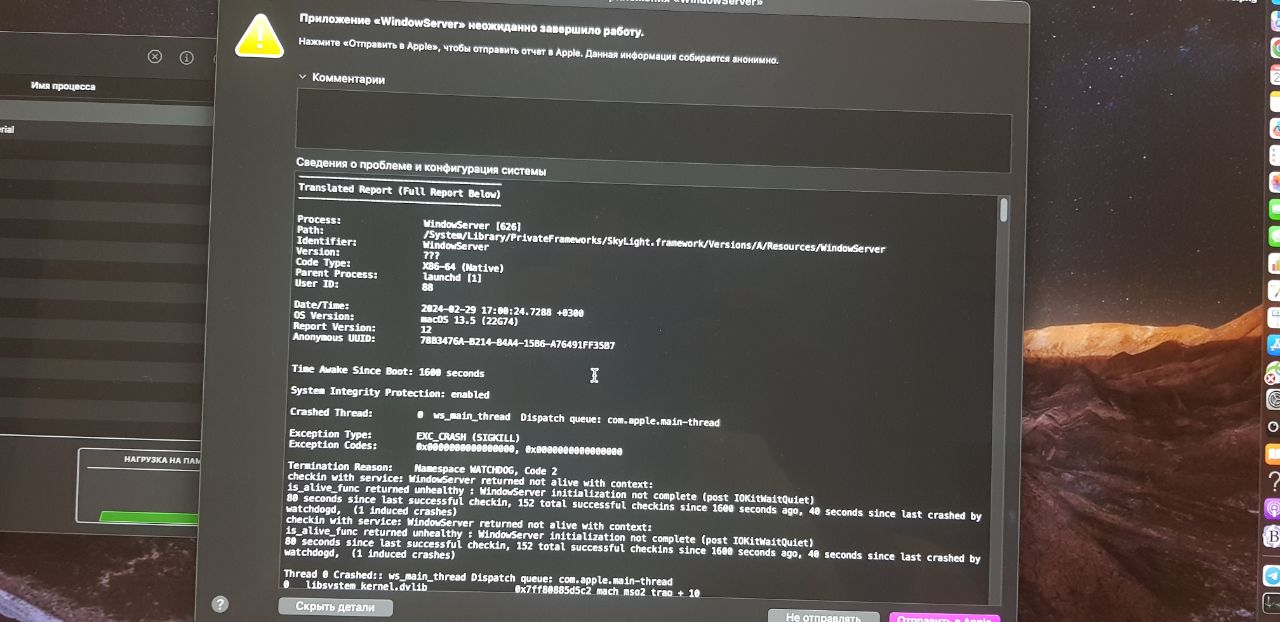 Я к вам с жирным багом: Отвалился комп с ошибкой windowServer(приложение для отображения окон) ОС: macOS Фото ошибки, какое успела, прилагаю. Компьютер после каждой перезагрузки просто виснет и перезагружается вновь. Удалось поймать момент и отключить wi…