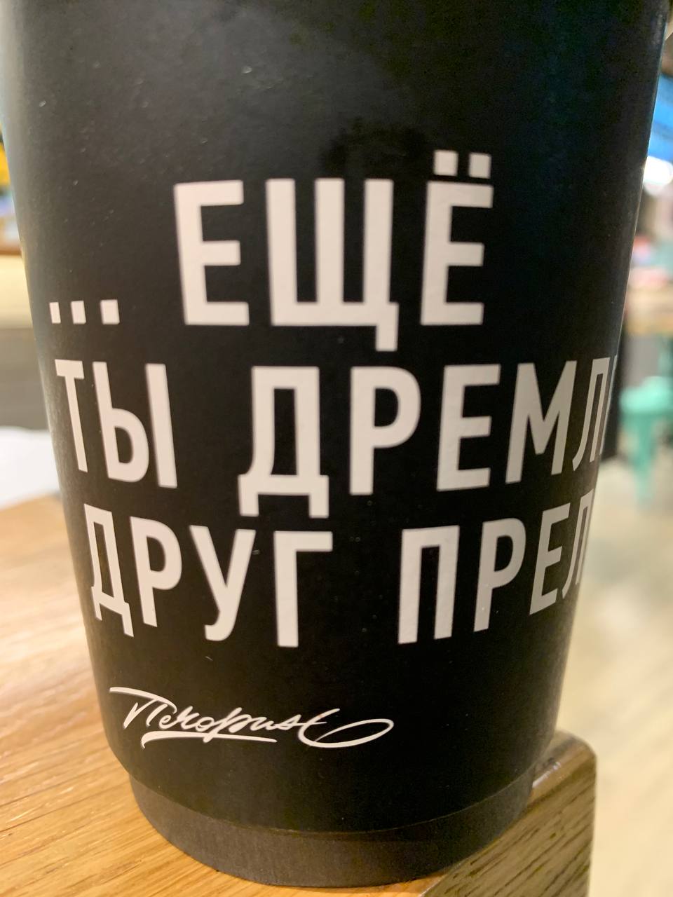 В пекарне «Печорин» на картонном стакане обнаружил текст «Ещё ты дремлешь друг прелестный». Вроде бы отсылка к русской классике, но есть нюанс. Печорин — герой Лермонтова, а текст на стакане — фрагмент стихотворения Пушкина.