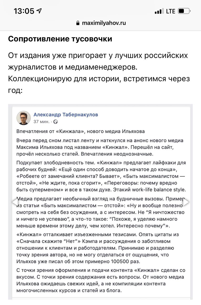 В ответ соавтор бестселлера «Пиши, сокращай» выпустил пост, в котором сослался на мою публикацию в разделе «Сопротивление тусовочки». Ильяхов причислил меня к лучшим журналистам и медиаменеджерам России, у которых пригорает от «Кинжала».