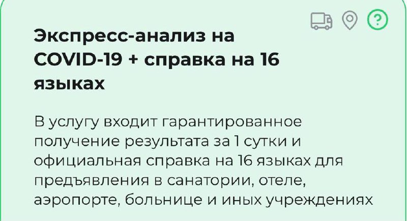 Вероятно, тот, кто описал услугу «Экспресс-анализ на COVID-19 + справка на 16 языках», отлично разбирается в лабораторных тестах и для него ПЦР-тест и анализ на COVID-19 — очевидные синонимы. Для клиента лаборатории, которому срочно потребовался тест перед вылетом — нет.