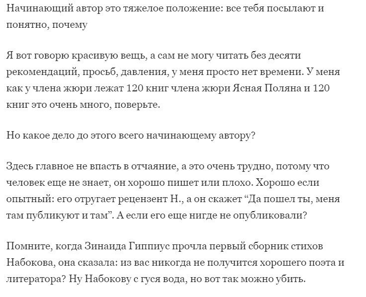 Очень точно подметил Водолазкин про начинающих писателей. Это вот вообще неимоверные, раскачиваемые диким отчаянием качели, на которых ты покачиваешься над бездной глухоты, немоты и полного игнора литературной общественности. Можешь писать и рассылать написанное по издательствам, толстым журналам годами, не получая ни единого малюсенького знака о том, что твоя проза чего-то да стоит. Потому что что? Потому что ты ноунейм, кому ты тут нужен, тебя тут не стояло, у нас тут всё на годы вперёд расписано кого куда печатать и кем восторгаться (и я рад бы ошибиться, конечно).