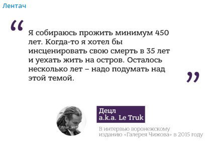С другой стороны, попалась картинка вот на «Лентаче»… Децл несмотря на свои амбиции, наверное, вполне способен был бы такое провернуть, это было бы вполне в его стиле, – свалить на Ямайку и действительно, утопая в облаках любимой дури, жить, читать свою рэпчину местным распиздяям ровно до 450 лет. А потом вернуться в прекрасную Россию будущего и сказать – «Йо, я живой, я всё ещё живой».