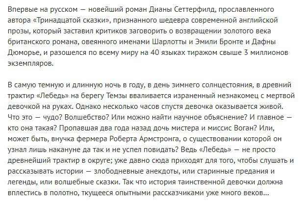 И я, пожалуй, понимаю, что тут «не того». Концептуальный замысел Сеттерфилд представить историю обнаруженной в реке мёртвой, но ожившей девочки, в которой три семьи «хотят» увидеть свою родственницу, в виде большой могучей реки с ответвляющимися руслами – он не получился. Кажется, сама Диана просто не справилась с задачей – очень уж хотела она слепить нечто такое викторианско-эмбиентное, атмосферное, со стилизацией, что ли, под Диккенса. Но в результате рассказанная история просто разваливается – не композиционно (хотя и к «речной», извилистой композиции можно предъявить претензии), а в силу какой-то чрезмерной надуманности.