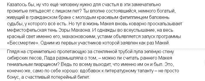 Короткая аннотация (+ отрывок из рассказа на скрине): «Россия, 23 век. Журналистка Лада по заданию редакции журнала отправляется на поиски одного из последних бессмертных - Макея, хранящего тайну, связанную с секретом его долгой жизни. Найдёт ли она Макея, сможет ли до конца разгадать природу этого странного, непонятного человека, выбравшего когда-то сознательное изгнание в одиночество?».