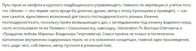 И вот совсем-совсем свеженькая, в этом канале ещё не представленная рецензия на кладбищенский талмуд Михаила Елизарова «Земля».