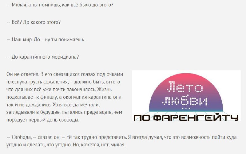 Один из моих рассказов ковидного цикла был выложен ещё летом на сайте «ГодЛитературы» в рамках конкурса «Лето любви по Фаренгейту». Рассказ называется «Аватары счастья» – он немного грустный, но, в общем-то, светлый, обещающий надежду, что всё не просто так.