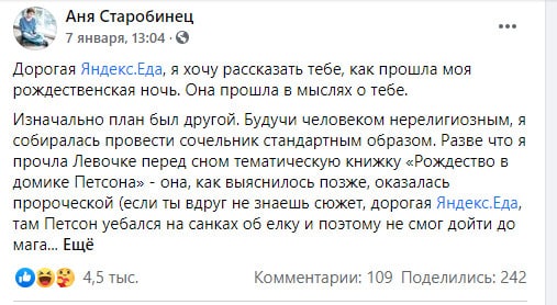 Теперь перейдём к хорошим примерам сторителлинга (опять же – ИМХО!!!!). Из того, что мне попалось на глаза из недавнего, запомнившегося. Писательница Анна Старобинец рассказывает совершенно чудную историю про то, как в новогоднюю ночь её несколько раз с заказом прокинула «Яндекс.Еда» – там каждое слово восторг, там саспенс и чудесный хейт-квест. Как результат – 4,5К лайков-эмодзи, 242 репоста. В следующем посте Анна отыгрывает, – типа, «Яндекс. Еда» извинились, надарили промокодов и вообще, на самом деле, они няшки.