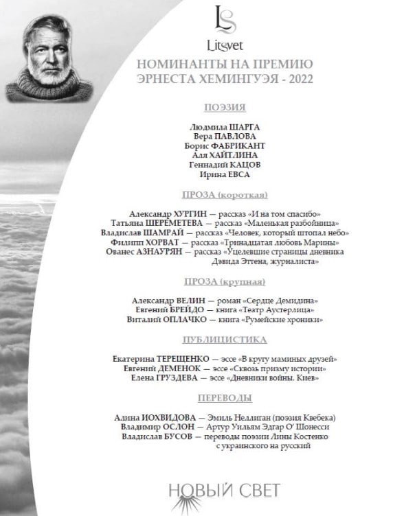 Штош, совершенно неожиданно для себя оказался в числе номинантов премии имени Эрнеста Хемингуэя-2022, организованной хорошим канадским русскоязычным журналом «Новый Свет», с рассказом «Тринадцатая любовь Марины».