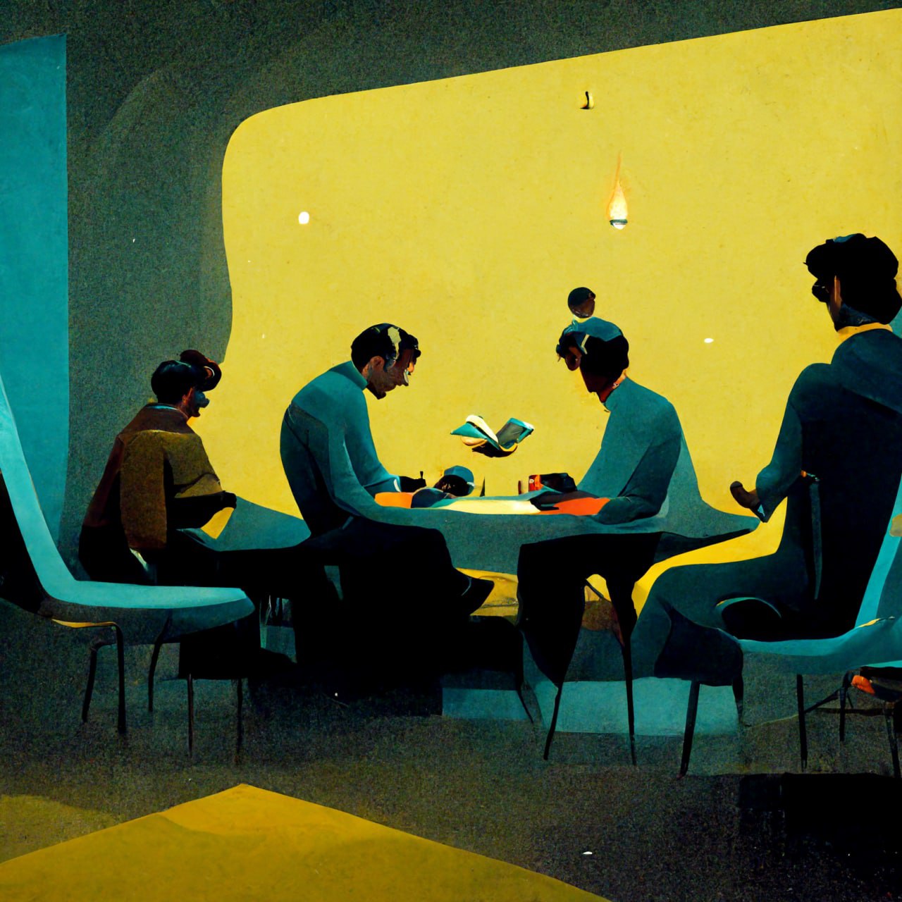 Картинка: результат работы Midjourney по запросу "A team of engineers trying to share knowledge"