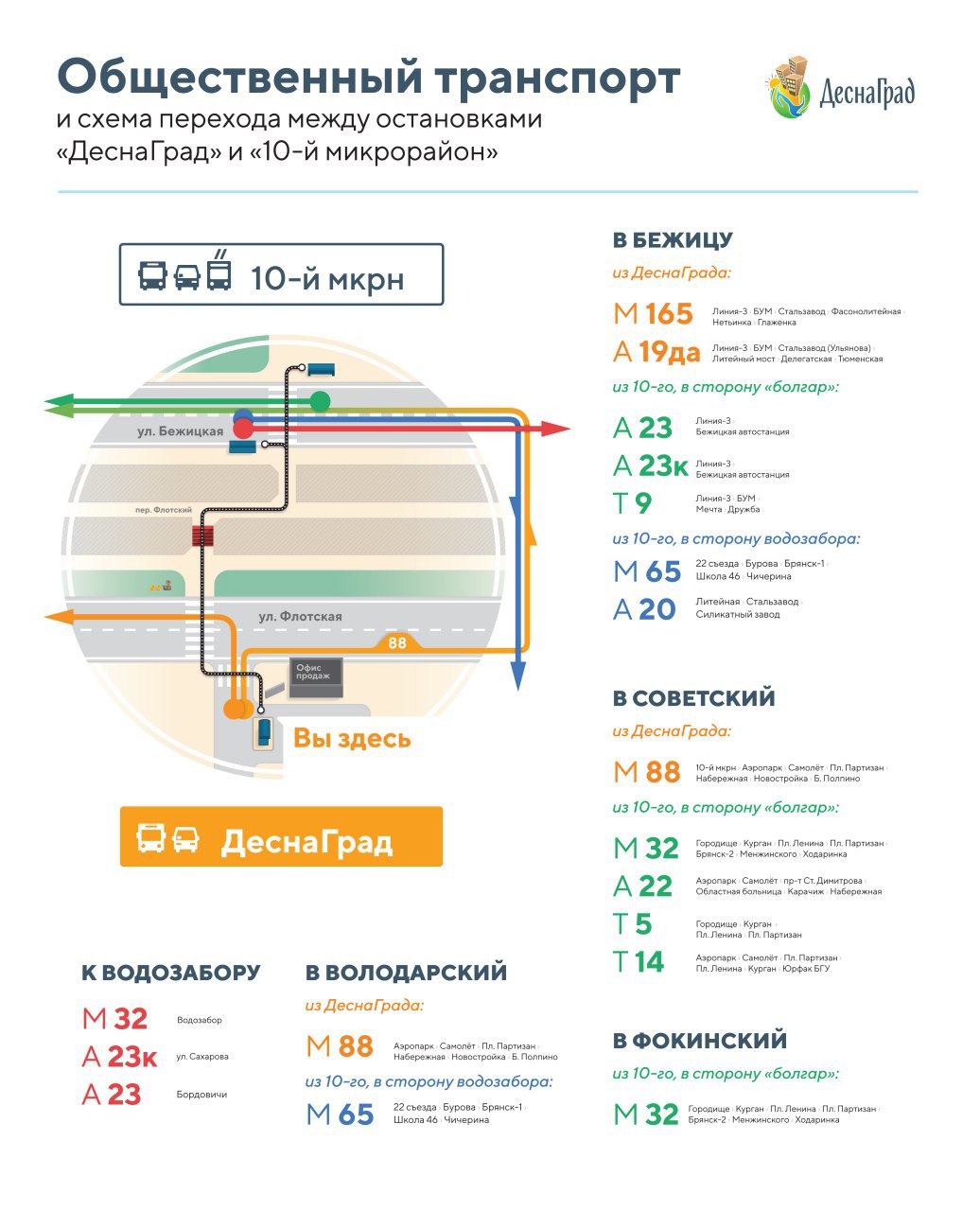 Есть строящийся микрорайон, в котором уже живёт тыщи четыре человек, и у которого есть неприятная слава находящегося в транспортной недоступности: мол, ни троллейбусов, ни автобусов. Это нехорошо сказывается на продажах, поэтому мы разработали схему общественного транспорта, на которой показали, что в принципе уехать можно и из самого микрорайона, а если пройти метров 400 – то появляется совсем нормальный ассортимент маршрутов. Плакат размещён на остановке в микрорайоне.